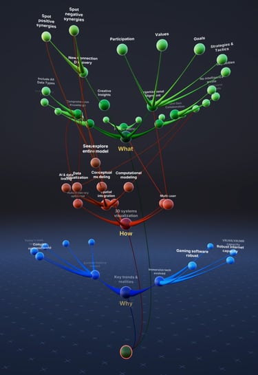 Designed for complex systems, Revlr operates in a fully 3D environment, providing exponentially more space to map relationships. While usable on a standard PC screen, it is optimized for immersive analytics in virtual reality (VR). Humans are naturally adept at understanding spatial information in three dimensions, making 3D environments especially powerful for learning and analysis.